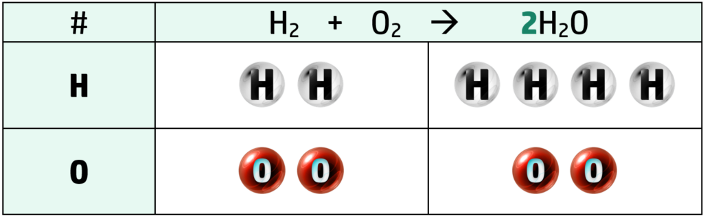Step 3: Continue this pattern until balanced. Here, we only need to put a 2 before the H2 on the left of the arrow and it is balanced.