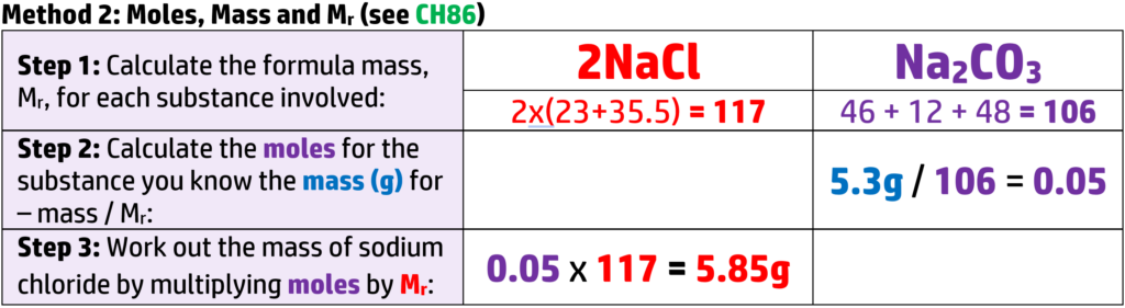 Example: Work out how much sodium chloride is produced when 5.3g of sodium carbonate reacts with excess dilute hydrochloric acid. (Ar: Na = 23, C = 12, O = 16, H = 1, Cl = 35.5).