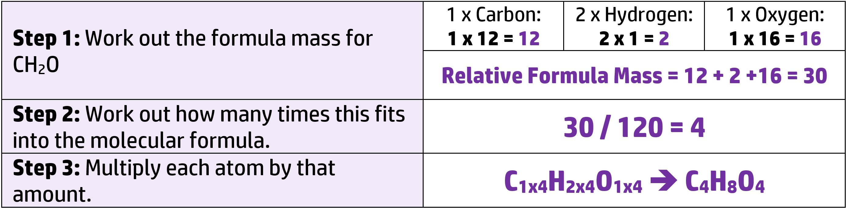 For example, work out the molecular formula of CH2O when the Mr is 120. (Ar: C = 12, H = 1, O = 1)