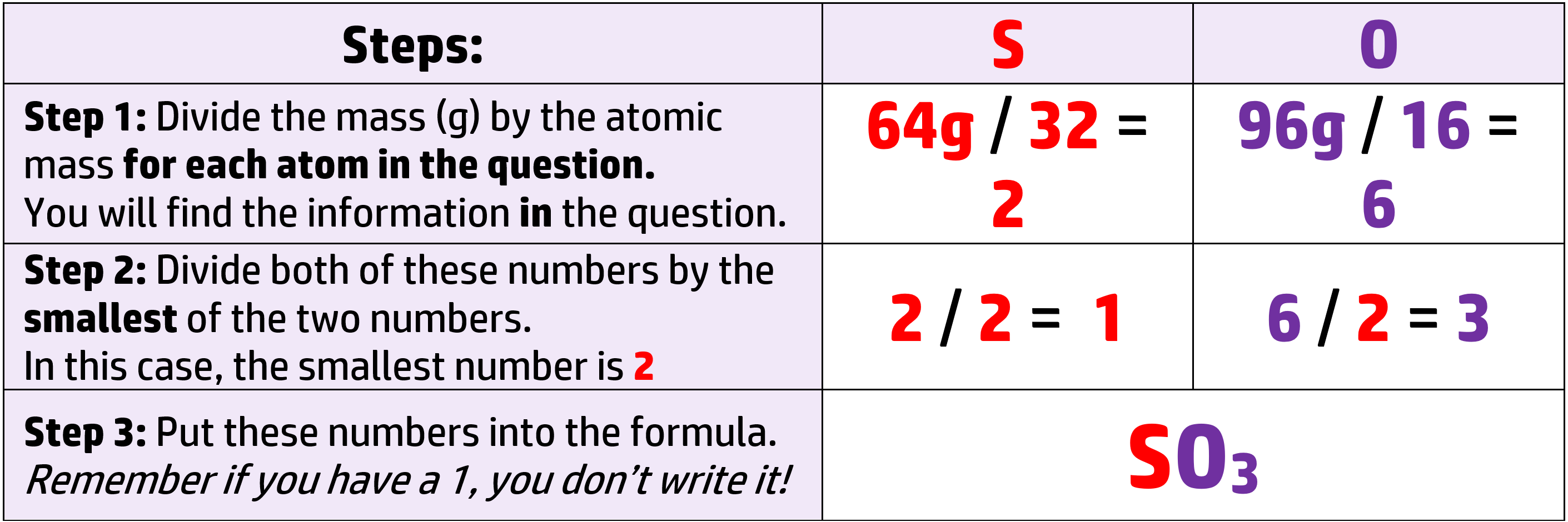 Example: 64g of sulfur reacts with 96g of oxygen to produce sulfur oxide. What is the formula of the oxide? (Ar: S = 32, O = 16)