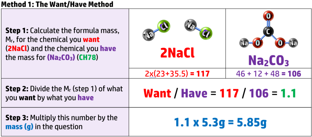 - Step 1: Work out the formula Mass (CH78) = 23 + 35.5 = 58.5