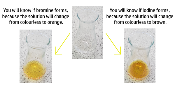 If you take a salt containing chlorine, bromine and iodine, and react them with solutions of their elements (Cl2, Br2 and I2), the following will occur: