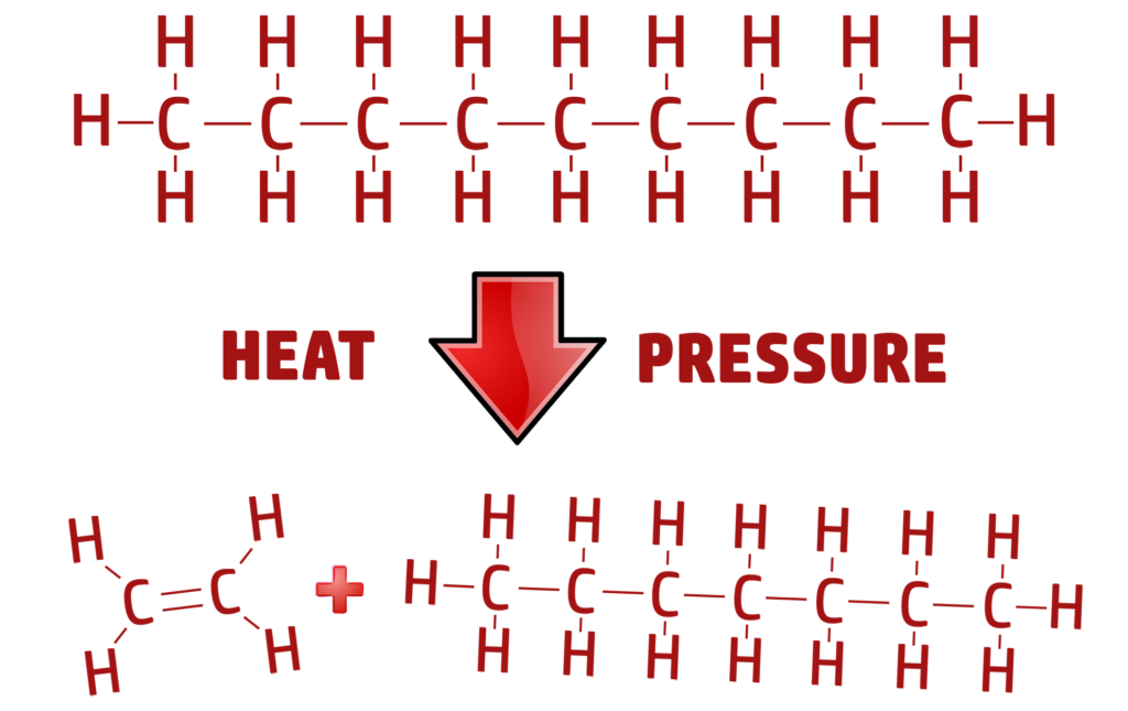 When a large-chained hydrocarbon (alkane) is put under heat and pressure with a catalyst, they are broken down into short chained hydrocarbons called alkanes and alkenes.