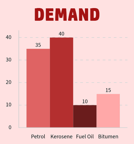 On the right, you can see that we have a large demand for petrol and kerosene, but the supply for each is not enough.
