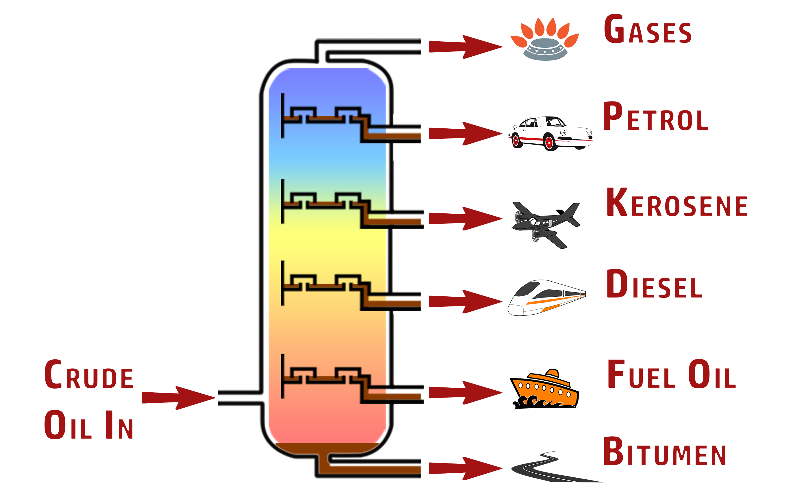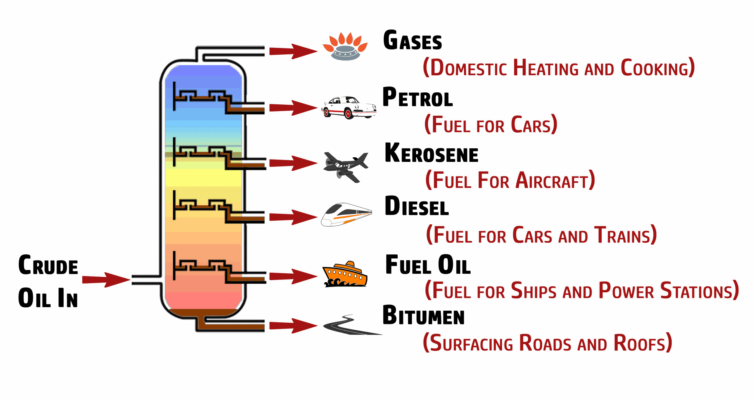 Crude oil contains many different fuels, with different uses. We cannot just put crude oil into our cars, for example – it needs to be separated into the different fractions.